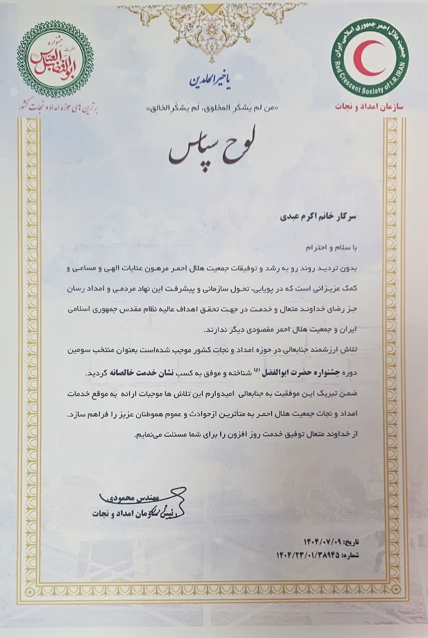 وی در ادامه گفت: در این جشنواره اکرم عبدی به عنوان یکی از برترینهای این دوره معرفی شد و "نشان خدمت خالصانه" را به پاس تلاشهای ارزشمندش در حوزه امداد و نجات دریافت کرد.